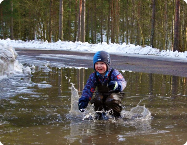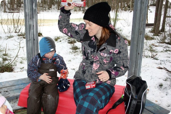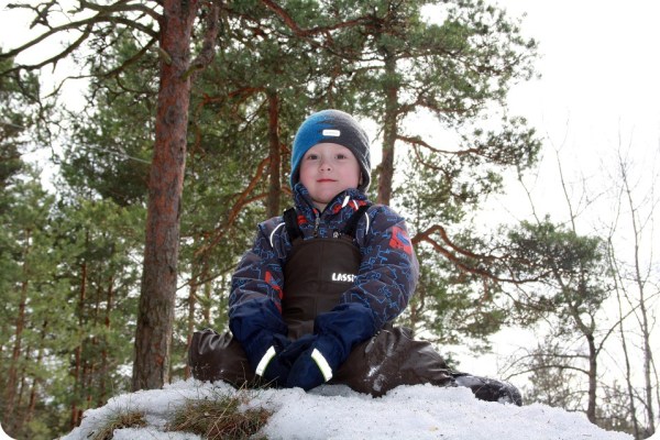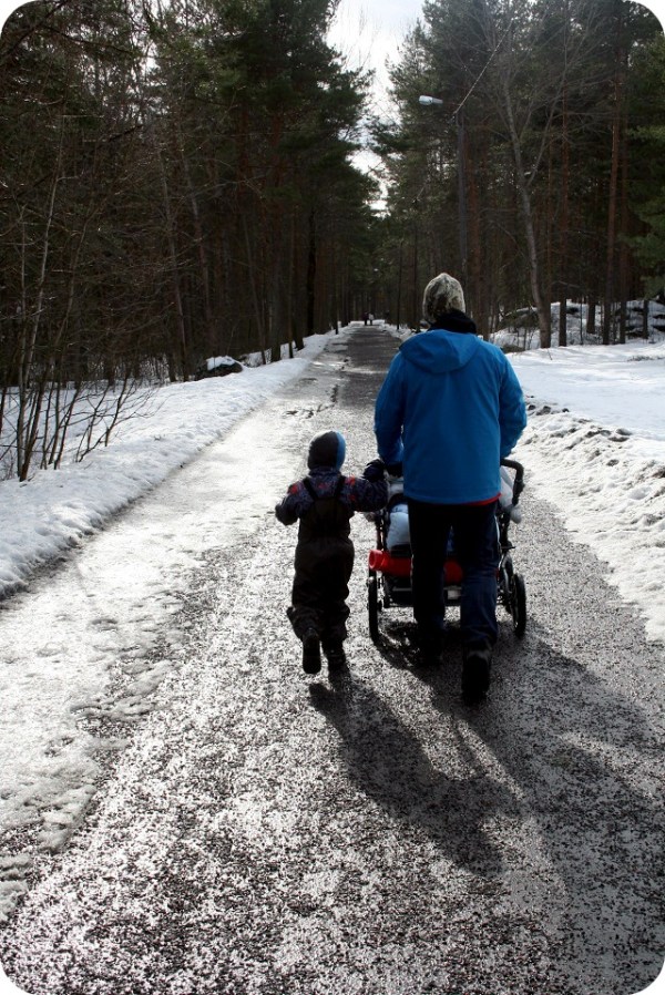 Att gå ut med tre små innebär att en gallskriker, att vi inte hittar vantar, mössor, att jag inte har några byxor och en annan brölar över att handskarna är borta eller att jag klär på i fel ordning. Jag drar på mig ett par tjocka vinterbyxor och undrar vilka skor man ska ta i det här vädret. Mika flinar lite åt mina vinterbyxor och jag blir arg, för nu vill jag bara ut. Jag glömmer mina egna vantar, men får ut alla bajsblöjsroskisar, mig själv och ungarna och sen, SEN går det bra! Då behövde jag de där höga gummistövlarna och vinterkläderna i alla fall. William och jag utforskar stigar och stenar, vi går till Stenstaden, tittar på Rammelträd och strosar längs Käännösmäki. Och försöker undvik all hundskit som folk tydligen tror försvinner av sig självt varje vinter!