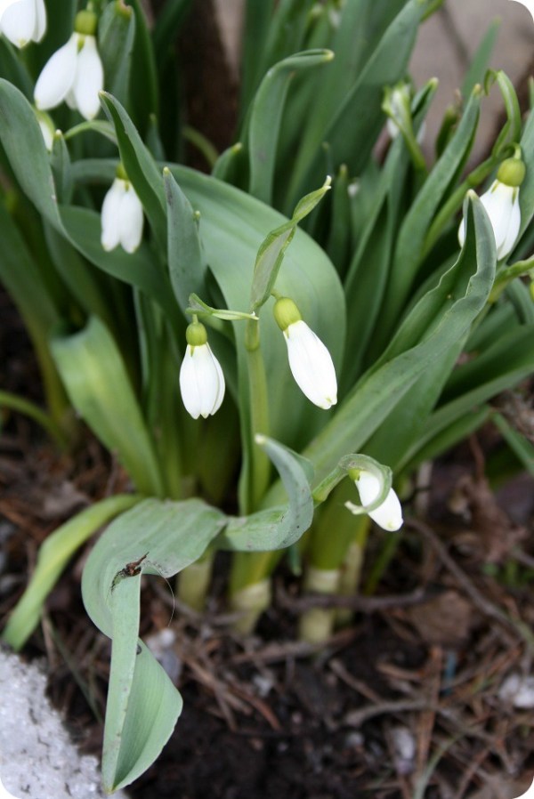 Invid en varm husvägg hittar jag vårens första blommor. Små, späda snödroppar tittar fram, fast snön och isen ännu ligger hård och farinsockrig på vägar och i skogen. Nu kommer våren, med stormsteg, fast det ännu blir bakslag. Det hör ju våren till.