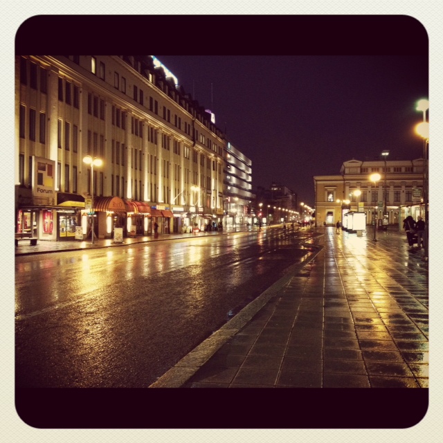 Nu sitter jag på bussen, fast egentligen sitter jag i min alldeles egen värld. Måste kolla ut emellanåt, så jag inte missar hållplatsen. Regnet smattrar mot den svarta asfalten och stadens ljus lyser upp i plaskvåta plättar och stänk på rutor. Fasen va allt låter bra. Jag känner mig som en rockstjärna i en video. Alla låtar jag hört så många gånger om, det är ju desamma, men känslan är helt annorlunda. För då finns bara jag och musiken.
