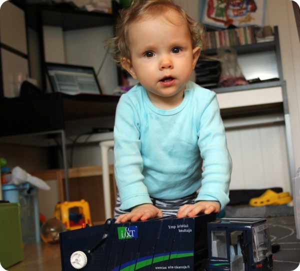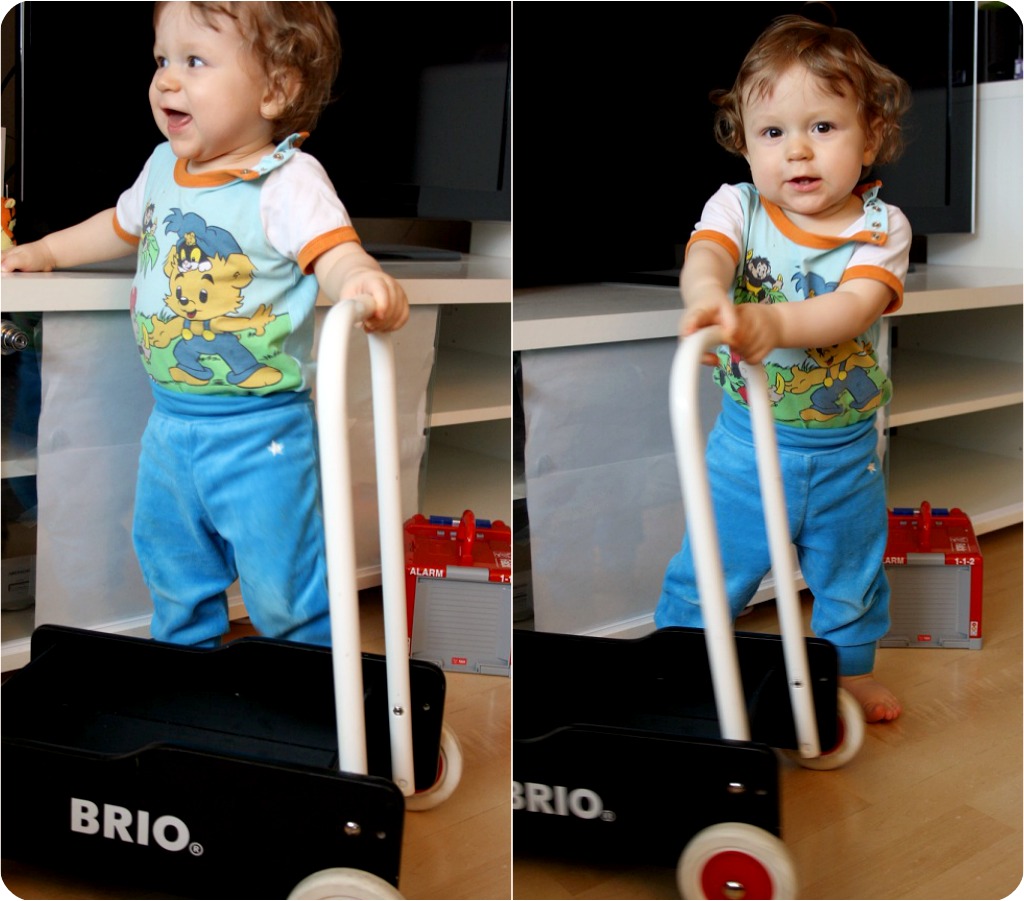 Isaac vill bara gå och gå! Mamma inte sticka! 😛 Plötsligt blev det fast på både hjulen och killen, även utan syrra i vagnen. Jag trodde hela tiden att Milja skulle vara den som börjar gå först, men nu verkar det inte alls så. Hon är nöjd att krypa på knäna än så länge. Det går ju med rätt bra fart det med.