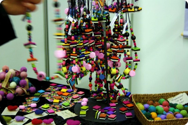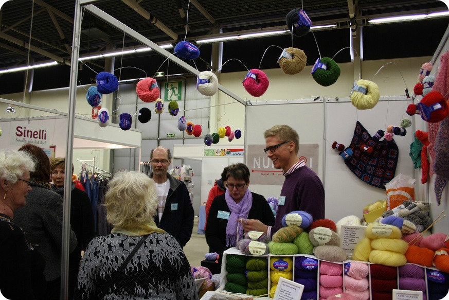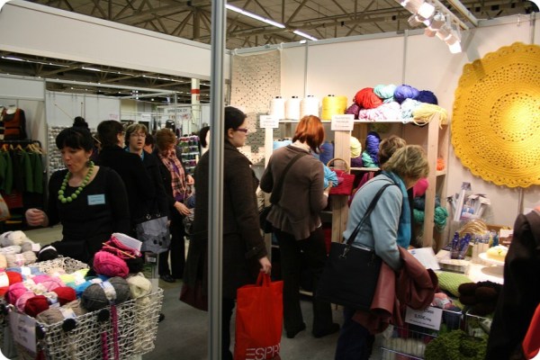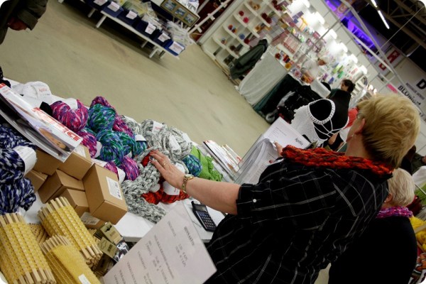 Väldigt mycket av trenden på mässan gick i att göra saker själv. Folk flockades runt de som visar hur man stickar sådana där frilla-scarfar eller vad man ska kalla dem. Det eller tjocka mattrasor, ontelolangat (mitt i bilden, uppe på hyllan, såna där megahärvor), som man virkar till stora korgar eller mattor. Jag köpte själv en liten härva i naturvitt och en virknål i storlek åtta. Fast jag vet att man får dem billigt på Ikea. Det är inte samma sak att köpa färdiggjorda. 😀