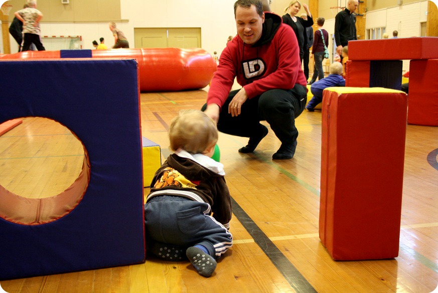 Idag var det första gången twinsen var med till vårt söndagsevent. Det var massor med folk, så de blev rädda till en början och Milja klamrade sig fast vid fammo och vid mig. Speciellt rädda blev de för den där grejen som blåser upp stora studsmattan. Efter ett tag, när några hade gått, vågade de i alla fall börja krypa runt. Milja hittade en annan bebis, som hon ville vara gullig med och peta i ögonen.