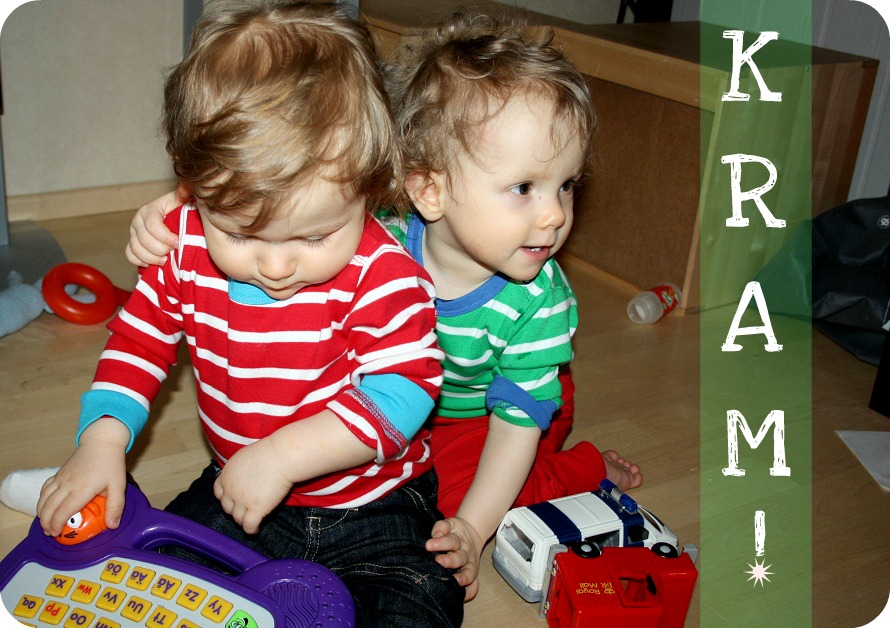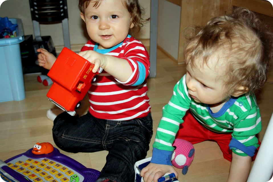 De leker med Williams gamla saker. Det är självfallet mycket roligare att leka med saker som är från tre år och uppåt och många saker klarar de ju av, fast de inte ”gör rätt”. Med andra ord: Det lönar sig inte alltid att följa åldersmarkeringarna, så länge de inte skadar sig eller får för små saker i halsen.