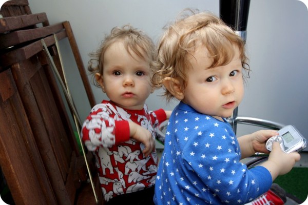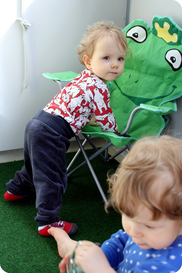 Twinsen och jag är ute på balkongen och de kryper naturligtvis precis där jag har försökt stänga av deras passage. De ger mig världens oskyldigaste miner om jag påpekar det. Och bråkar som samma leksak mellan varven, för det finns bara en sak i hela världen som är jätterolig. Det blev för varmt på balkongen efter ett tag, det är redan över 25 där på dagarna!