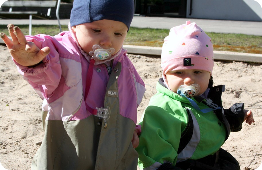 Förutom att jag är lite slak fortfarande, tycker jag det är trevligt med solsken. Våren är bra, för då är det precis lagom varmt. 15 grader eller möjligtvis 20 är ypperligt. Det är förresten inget kastmärke Milja har i pannan, det är batat. ^^