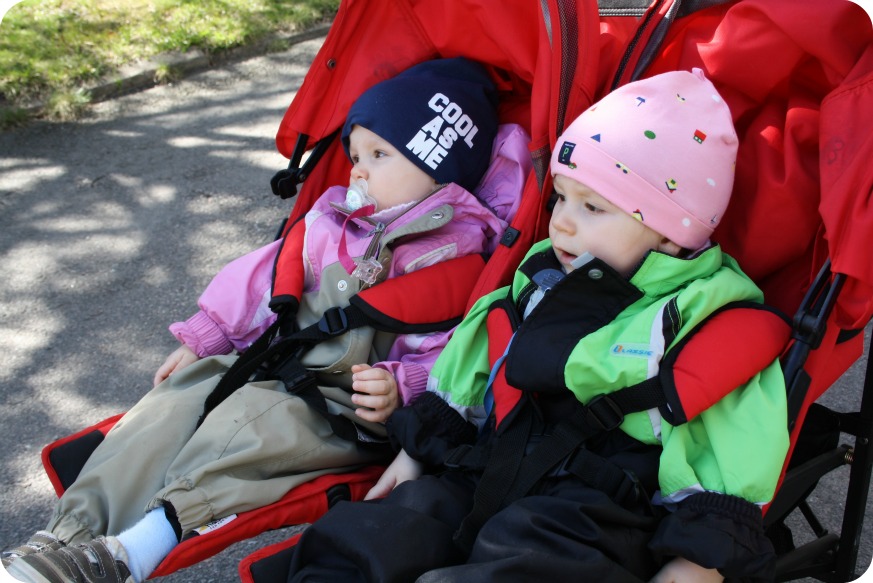 Solen skiner idag, men det blåser svalt. Jag tar ut twinsen en stund och livet återvänder. Så småningom. Det går trögt i uppförsbackarna. Kanske för att jag är ovan med den här resevagnen. Den andra ska på reparation, men faktum är att den är mycket lättare att köra, fast den är tyngre. (Den här vagnen skaffade fammo begagnad och det var tur det, eftersom vår egen inte funkar)