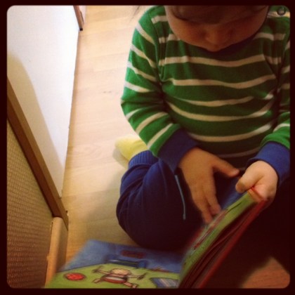 Isaac håller på att läsa sönder ”Knacka på”. Han vill inte lämna ifrån sig den alls. Kanske man skulle låta honom läsa sådär hårt och satsa på en ny bok? För jag vill inte att alla grejer eller böcker vi har, ska gå sönder. Oavsett hur älskade de är.