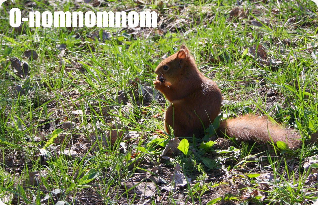 Vi hälsar försiktigt på en oblyg ekorre. När jag kommer en och en halvmeter nära, slutar han snaska kotte och pilar iväg en bit uppför trädstammen.