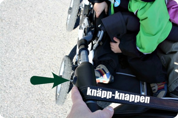 Vår vagn funkar igen! Fixar-Faffa öppnade den där mojängen vid teleskophandtaget och så sprätte den ut. Jag fattar inte hur man kan designa en vagn såhär. Alla vet att syskonvagnar är stora och breda . Så sätter man två tryckknappar LÄNGST ut, så att de tar i alla väggar, hissdörrar och gavlar när man går förbi. Vad är det för sätt? De är lite vinklade, men de kunde väl vara på ovan- eller undersidan om handtaget, så man inte riskerar att klämma sönder dem.