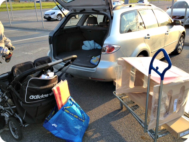 Det var däremot inte det lättaste att få hem den här oböjbara grejen. Hur tänkte vi här? tänkte vi när vi klämde in dubbelvagn och rutschkanor i bilen. Men det gick! Hah, det gick! Fast jag fick sitta ihopkrupen med ett par platsbitar i skallen (KOLON golvskydd) och fötterna uppdragna i en redan beklämmande sits mellan twinsen. Det är tur att vi bor nästan granne med Ikea.