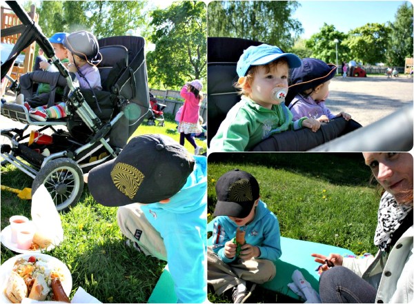 Idag var vi på vårfest med dagis. Det bjöds på underbar sång och musik av ungarna, som satt så prydligt uppradade. Till och med William sjöng, men tittade ner varje gång jag log och applåderade. Milja var lite förkyld och febrig, men vi stannade en stund i alla fall, eftersom det var lagom varmt när solen sken. Det bjöds på korv och pastasallad och saft. Fast varje gång undrar vi varför de inte har nåt vegetariskt alternativ? Det vore ju inte så svårt att lämna bort skinkan ur pastasalladen eller ha den vid sidan om?