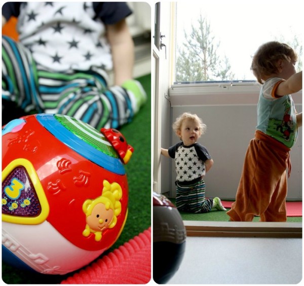 Vi har förresten ett bollproblem. Om ungarna kastar nåt, brukar jag säga: ”Nej, man får inte kasta. Bara bollen får du kasta” eftersom vi har ett par mjuka bollar. Jag har stoppat undan den spelande bollen, men tog fram dem igen och nu försöker Milja kasta den. Hmm. Hur förklarar man det?