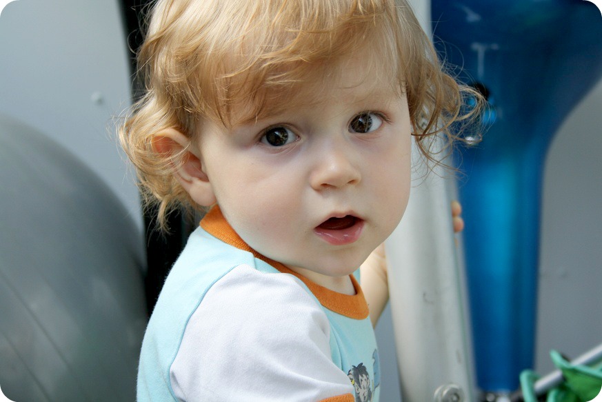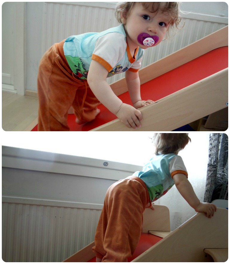 Isaac favorithobby: Att klättra uppför rutschkanan från fel håll. Sen släpper han sig sakta och hasar ner. Och skrattar. Detta upprepas cirka femtio gånger. Egentligen tror jag han vill allra högst upp, för han tror att han kan se bilar utanför fönstret.