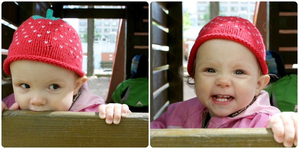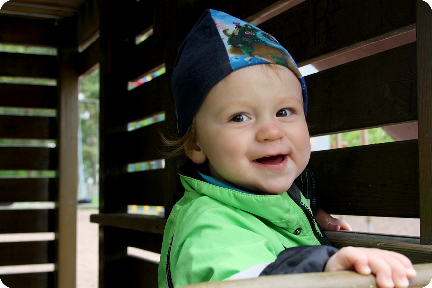 Men sen är vi ute och då går det ganska bra. Jag stretar långsamt uppför backarna i den kuperade terrängen, medan ungarna vänder sig bakåt, hur jag än har vagnen. Jag skulle kunna ha bältena på dem, men orkar inte pyssla med dem hela tiden, så länge ungarna hålls i vagnen. Vi kommer till nedförsområdet och jag har hunnit hämta andan. Solen tittar fram, det blir fasligt varmt. Vi stannar vid en lekpark och gungar. Fast när ungarna vill rutscha säger jag ner. Det är en skithög rutschbana och jag orkar inte lyfta dem fram och tillbaka hundra gånger. Istället hittar vi en mysig koja som blir en perfekt lekplats en lång stund. Där kan man dessutom se på bilar, så tadaa, det är perfekt!