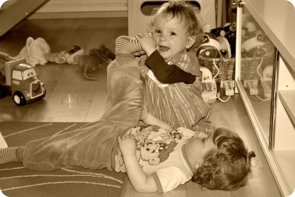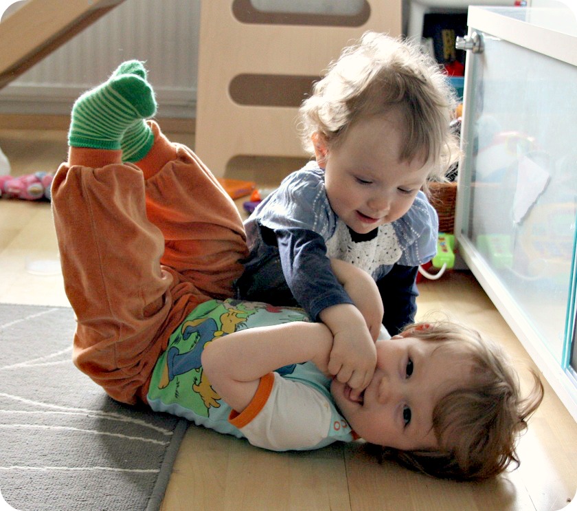 Här pågår tidig morgongymnastik och en del småbitande och kramar under protester. De leker i alla fall ofta tillsammans och det är skönt att se!