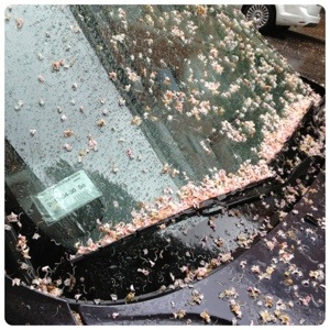 Vi traskar vidare i regnet och går genom hopar av några rosavita blomster som faller ner i mängd och massor ur träden.