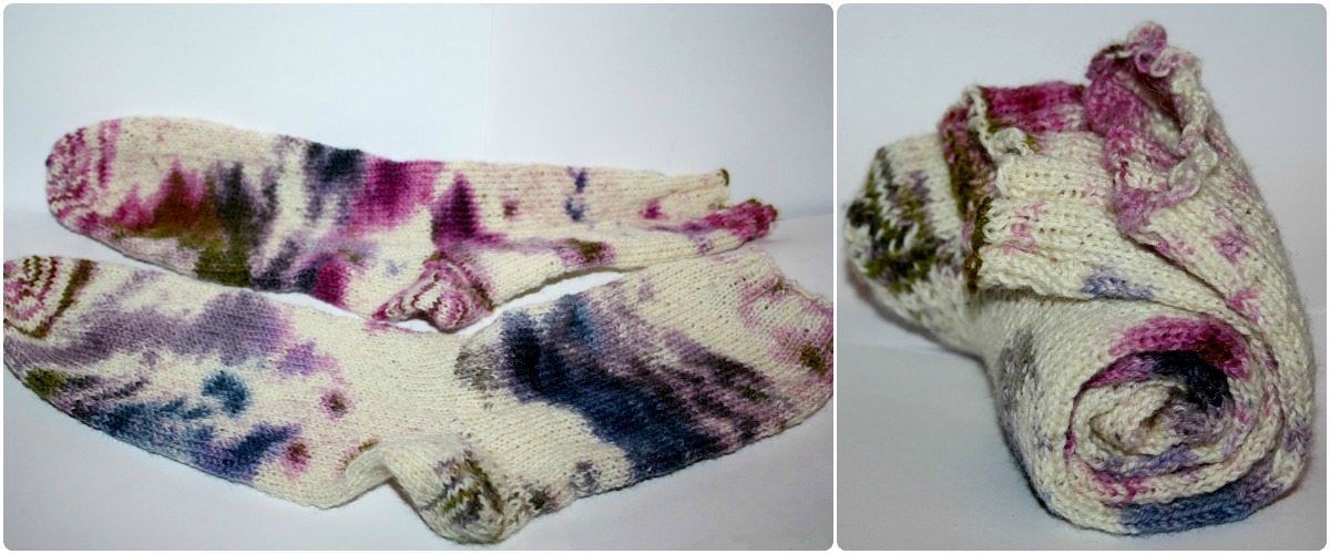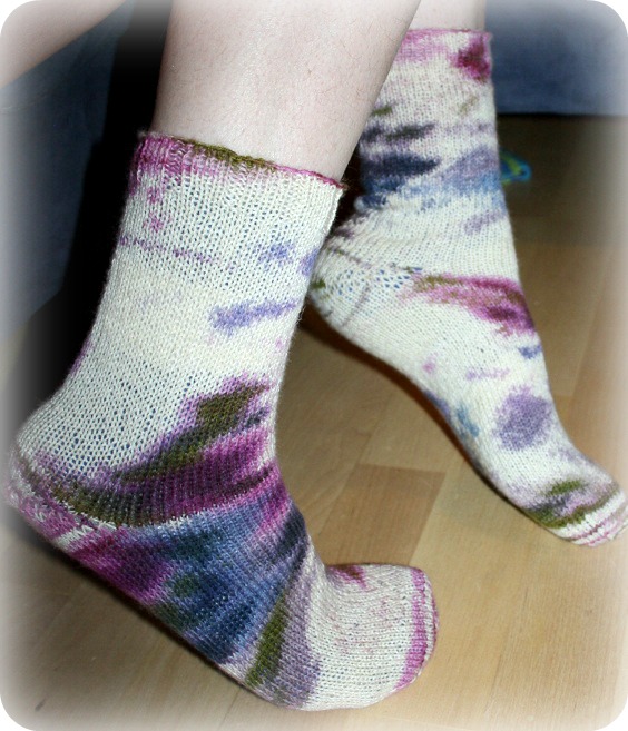 Jag har stickat färdigt mina fläcksockor! Det ser ut som om man klampat runt med vita sockor i en blåbärs- och lingonskog. Garnet heter Schoppel-Wolle Wunderkleckse och var riktigt klurigt i början. Det stod ingenstans om hur man skulle få fram fläckarna, det blev bara randigt, som vid tårna. Sen provade jag med samma mått som jag hade för ett par andra Schoppel-Wolle (Fligende Undertasse-garnet) och då funkade det med 60 maskor! Men jag rev upp tre gånger och dessutom rev jag upp första gången jag stickade hälen, för det såg inte bra ut med en vanlig häl.