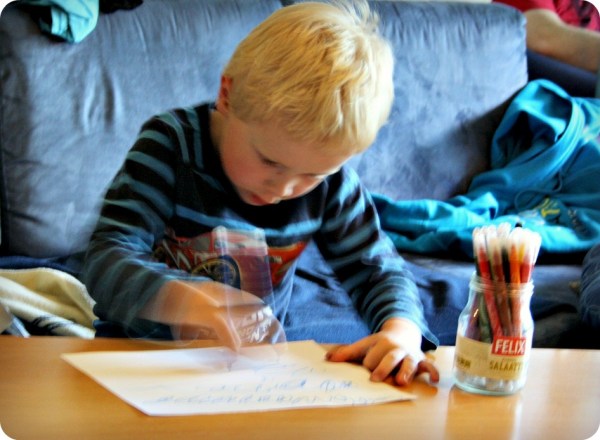 – Jag ritar inte. Jag skriver. Säger gossen och skriver skrivstil med en väldig fart.