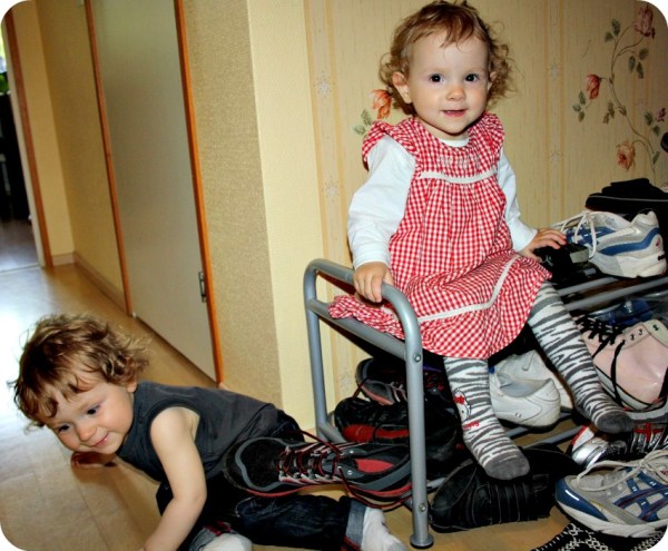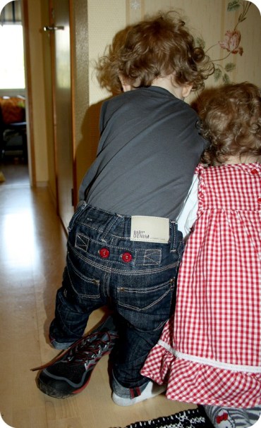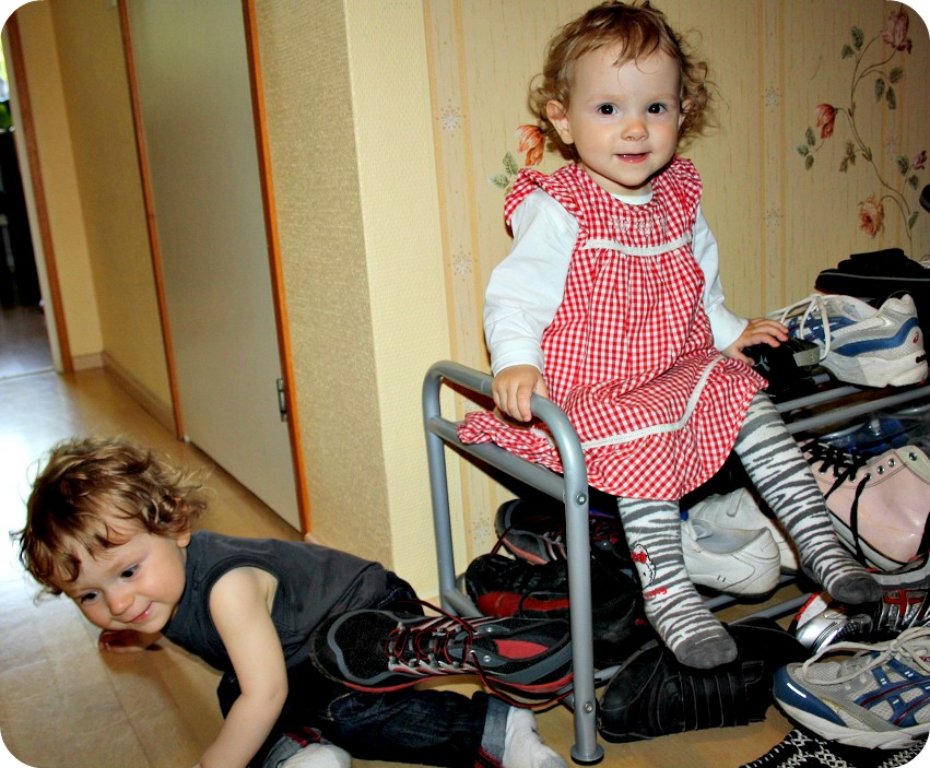 Det är ett par sällsynt nöjda tvillingar jag har här idag. De leker och pysslar, kastar runt skor och bläddrar i böcker. Petar in nappar i min handväska (vilket jag såg först efter att jag tog något ur den. Inte konstigt att alla nappar försvinner!) och leker tillsammans. Inget bitande, väldigt lite bråk, det är nästan för bra!