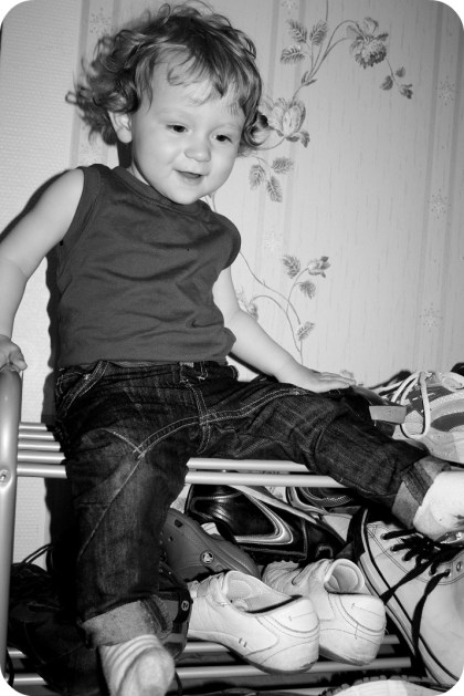 Idag satte jag en ärmlöst linne och födelsedagsjeansen på Isaac. Då blev han plötsligt en stor kille. En hunk! Bland skor!