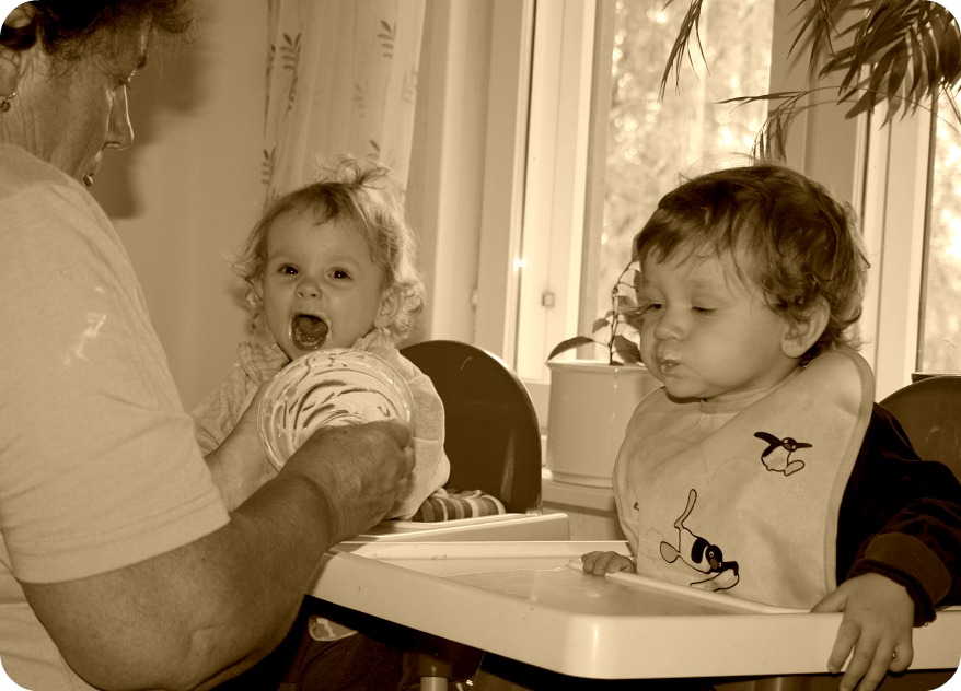 Isaac och Milja har upptäckt trappor och är i full färd med att krypa upp- och nerför fammos trappa till ytterdörren. Det går jättebra och vi låter dem krypa ett tag. Sen blev det regn och alla gick in. Jag gillar regnet, det smattrar så mysigt på fönsterblecket.