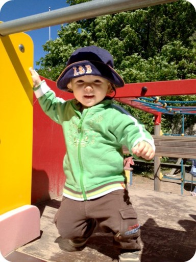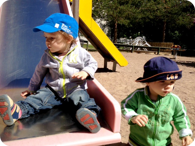Ute i parken är det fler barn än vanligt och twinsen är mer försiktiga än normalt. Jag är hungrig hela tiden, det måste vara för att vi trots allt rör på oss en hel del. Men det blåser kallt. Segelväder, tänker jag och tänker på 23 utlovade plusgrader till fredag. 😀