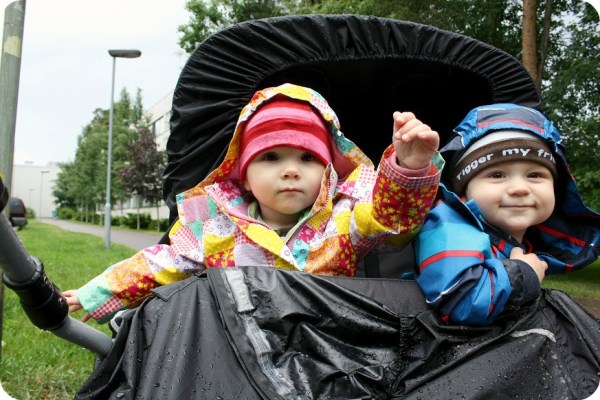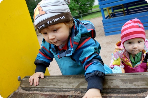 Vi är ganska knäppa. Bebblorna och jag gick ut när det började åska och regna. Och egentligen skulle jag väl ha promerat med dem först och sen lekt i sanden. Nu blev det tvärtom. De ville ju så gärna rutscha. Sand och vatten är våra nya element.