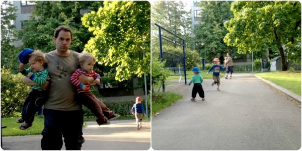 Utelekandet tar ny fart genom att en av tvillingarna turvis sticker iväg. Det är tur att vi är två vuxna. Det här med sommarlov känns som en enda lång lördag.