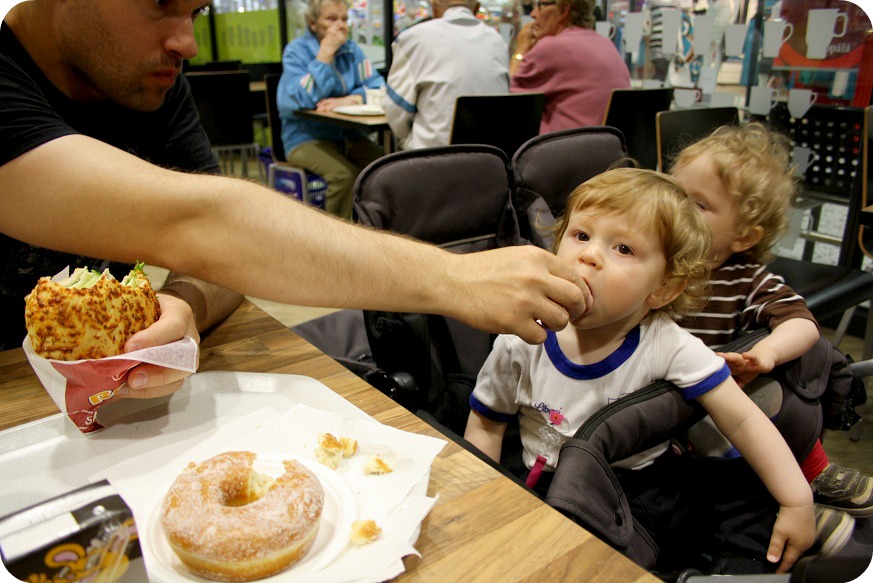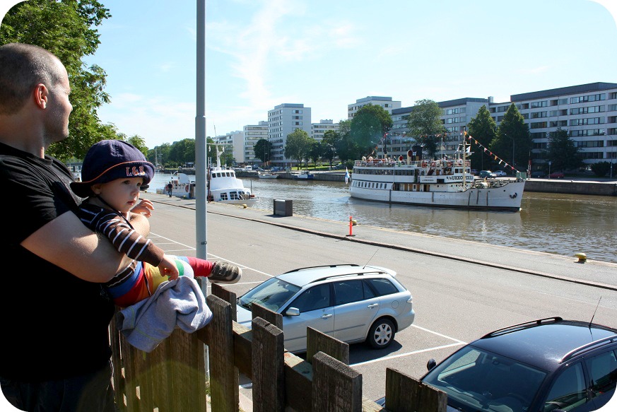 Vi tar ett tidigt parkhäng i stan, sköter ärenden och kollar på båtar i den varma sommarsolen. Vi tar en kaffe med bullepaus på ett café, charmar pensionärer och twinsen får smaka lite munk. Mmm, så gott!