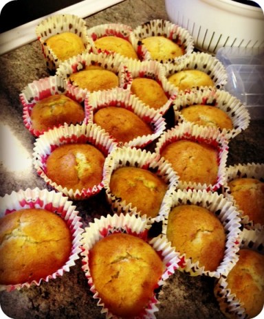 Receptet tog jag härifrån men jag satte kardemumma istället för kanel, det är godare! Rör eller vispa inte för krafigt, utan följ receptet, så får du fluffiga och goda muffins! De här får inte hellre sådana där svarta trådar i sig, som bananmuffins ofta har, utan är helt släta.