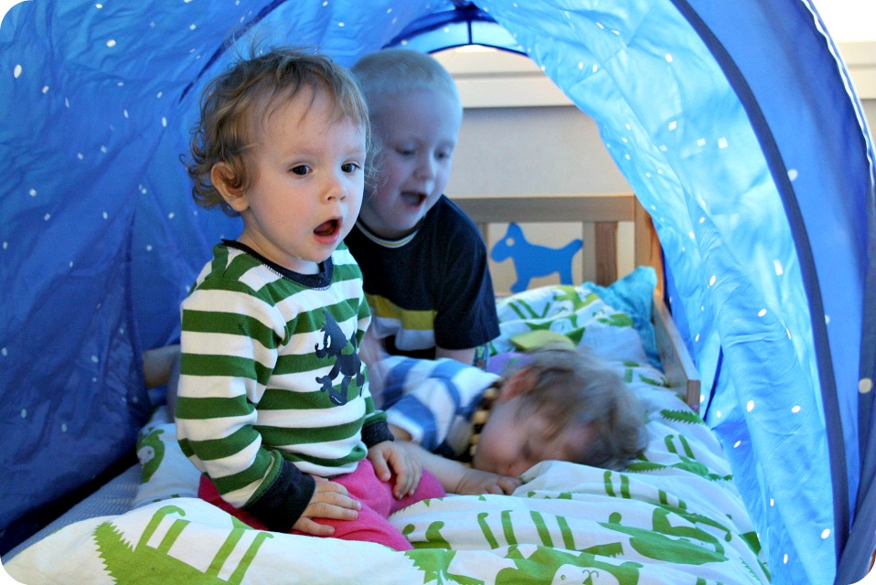 Nu sover en mellanstor kille i sin båt och två  mindre i mammas och pappas säng.