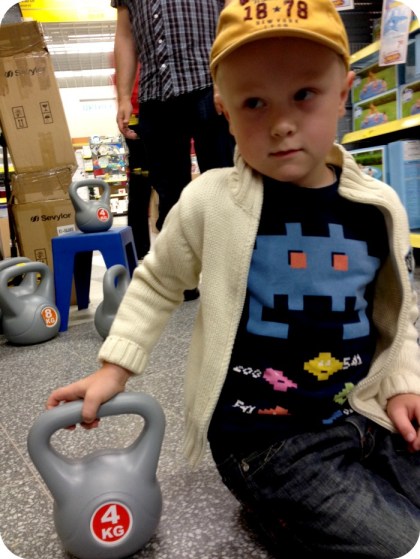 William blev utlovad ”nån liten grej” från stan. Vad väljer han? Jo, en fyrakilos kettlebell. Han vill träna som pappa.