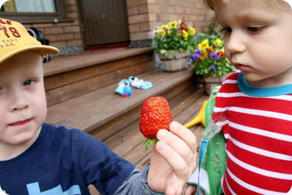 Isaac älskade mommos jordgubbar och William hängde på. ”Kaka!” sa Isaac och slukade bit efter bit.