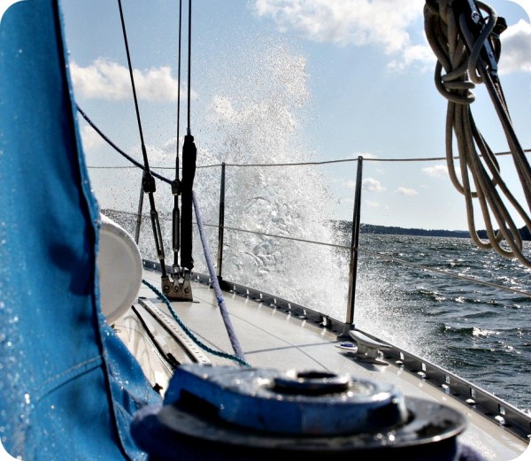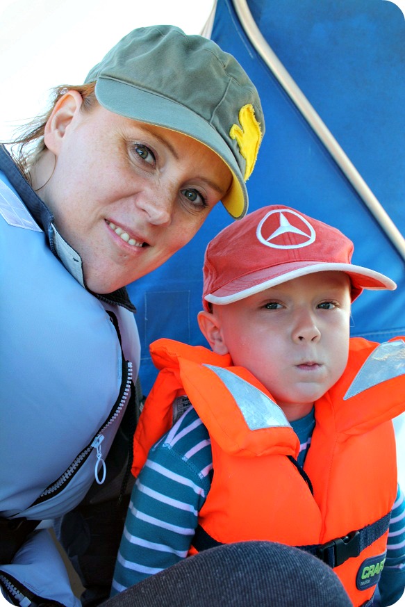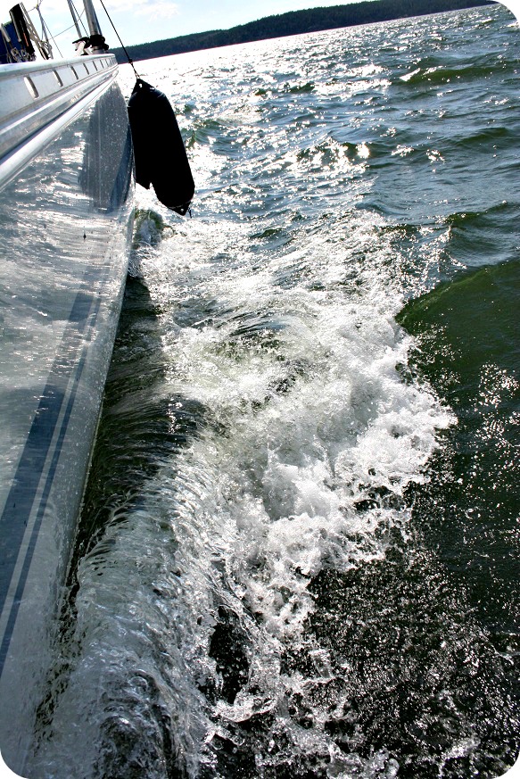 Igår åkte vi i motvind och W satt bak med mig och faffa, som stod vid rodret. Sonen skrattade gott åt gratisduscherna vi fick!