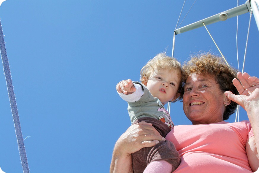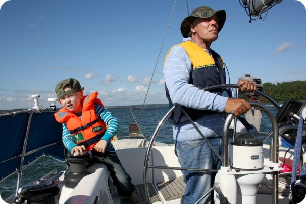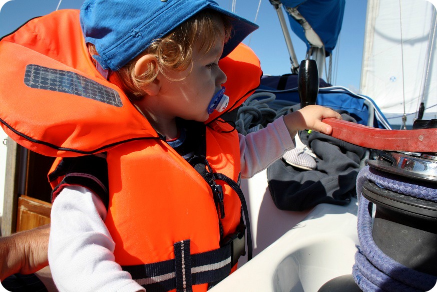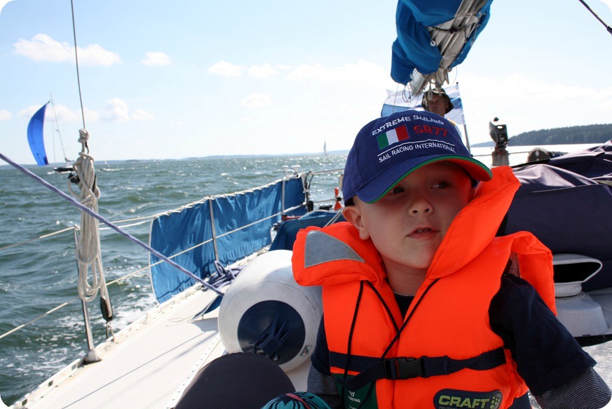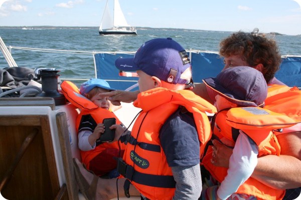 Det är inte helt lätt att ha två ettåringar i båten, men med hjälp av fammo och faffa gick det riktigt bra. På hemvägen blev det lite långtråkigt, eftersom vi seglade, dock med bra fart (mellan sex och åtta knop) men twinsen ville springa runt mer än det fanns plats till. 🙂