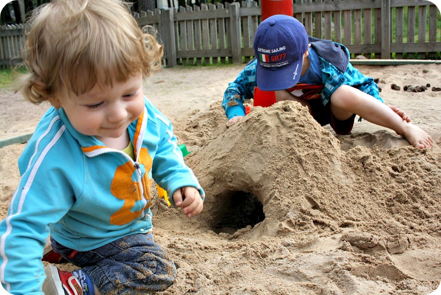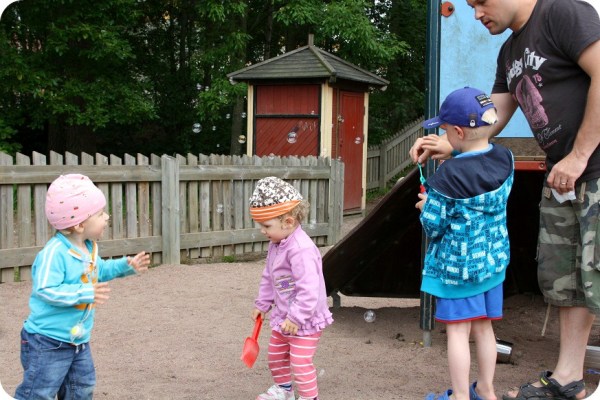 Vi gick i alla fall till en annan park och fortsatte blåsa bubblor, bygga fantastiska sandslott. Milja ramlade på en klätterställning och slog i läppen så det blödde läskigt mycket. Isaac föll ner från rutschkanan så han grät och grät, men vi överlevde. Ungarna åt i alla fall min ugnsforell med dragon och örter med stor aptit.