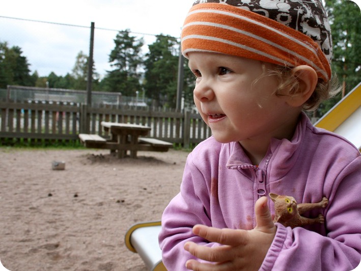 Vi gick därifrån, jag blev så arg så jag grät när vi kom till den andra parken. Arg för att de där var så sura, för att jag kände mig så i vägen och för att det blev en liten sak av en stor. För att jag inte själv kunde behärska mig, gå fram och fråga vad vi gjorde för fel? De kan väl gå till sin pensionärsförening om de förväntar sig lugn och ro på en plats som är avsedd för lek, en plats som tillhör Åbo stad. Varför kan man skriva nåt i stil med ”Den här parken tillhör Tornhusen. Var vänlig, städa efter dig, och lämna den i fint skick.” Eller nåt liknande. Det kommer fler och fler Privat-skyltar här i området och jag tänker på barnboken Fyra hönor och en tupp (en personlig favorit), där den lilla, ensamma tuppen bara ville bestämma och till slut lade upp skyltar överallt. När hönorna äntligen vågade säga nåt, sa de: ”Vi vill dela rättvist” och då blev tuppen så förskräckt att han ramlade omkull och tappade talförmågan.