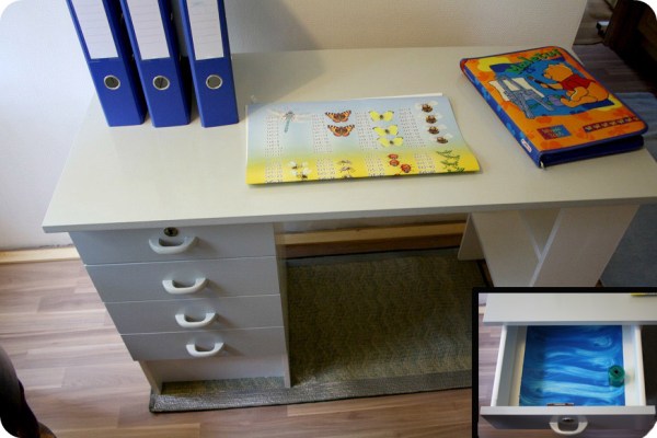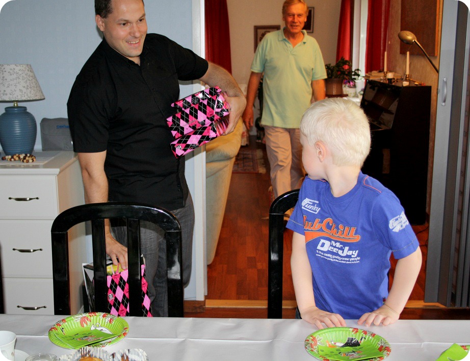 Den största presenten var ett eget skrivbord. Fammo hade målat om ett alldeles perfekt skrivbord åt W. Han gick förbi det flera gånger innan han fattade att det där bordet var en present! Inuti lådorna var det blått, blått som havet. Faffa lovade fixa ett nytt lås/ny nyckel till lådan. Det blir bra, William behöver platser som inte tvillingarna kommer åt, när både han och de blir större.