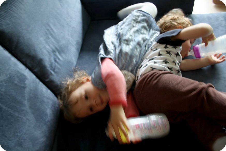 Jo, det är tungt mellan varven. Sjukt tungt. Man räknar till tusen. Som i morse när tvillingarna inte ville äta. De tog liksom simtag i mattallrikarna och jag visste inte vad jag skulle hitta på, för att få dem att äta nåt. Sådana gånger känns bebistiden väldigt lång. De rullar runt i soffan, petar på tvn och luttrar med mjölken. Vildar till sig.