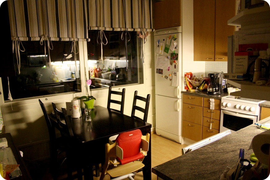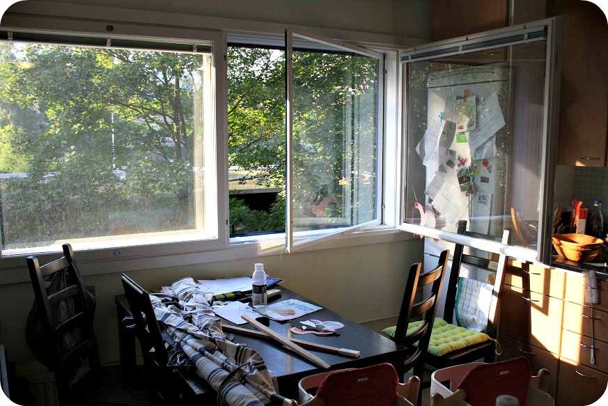 De flesta brukar säga att man inte ska stressa för mycket över hushållsarbete och städning när man har småbarn. De rör ju till det igen. Men nån måtta får det vara. Idag tog jag itu med köket, tvättade äntligen de där jättedammiga, stora fönstren, utan att något barn föll ut.Jösses, jag skäms ju nästan! Men NU är de rena! Dammade gardiner, pantade flaskor, städade undan glas och burkar, tog fram en köksbänk som vi inte sett på över ett år. Och det är så skönt! Nu har jag sovrummet kvar, men det får vänta ett tag. Vi har två stora fönster där, som ska öppnas och tvättas, sen är det lugnt.