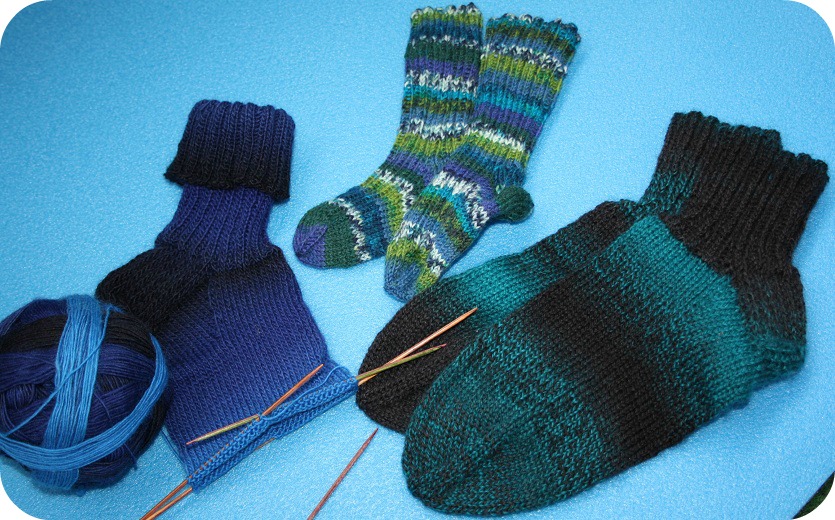 Och hur orkar man framåt? Tja, jag stickar. En massa sockor, väldigt enkla just nu, men det går snabbt och jag ser resultat. Det är ljuv terapi och det finns alltid ett par fötter som behöver sockor, speciellt nu på hösten. PS. Jag tog inte med alla mina senaste verk, det skulle se ut som om jag är med i Anonyma Sockstickare. Vilket jag faktiskt är, på Ravelry!