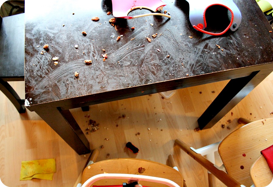 Av sånt blir man sur och sne. För att det inte går att dammsuga upp, för att man stått där och kockat, för att magen kurrar, medan ungarna leker fågel, fisk eller mittemellan med det man lagat. Sånt är tråkigt och tidskrävande och tålamodsprövande. Och man torkar och torkar och det verkar som att man bara smetar ut kött och grynost mer och mer istället för att få upp det.