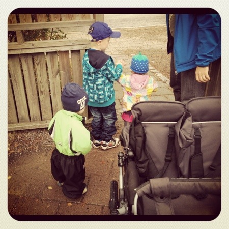 Idag lämnade vi twinsen en timme. Egentligen skulle det kanske ha gått bättre om jag stannat borta längre, för Milja ville inte somna eller sova. Det är en sak att underhålla henne hemma, en annan att hitta ett ställe hon kan vara på utan att väcka de andra.