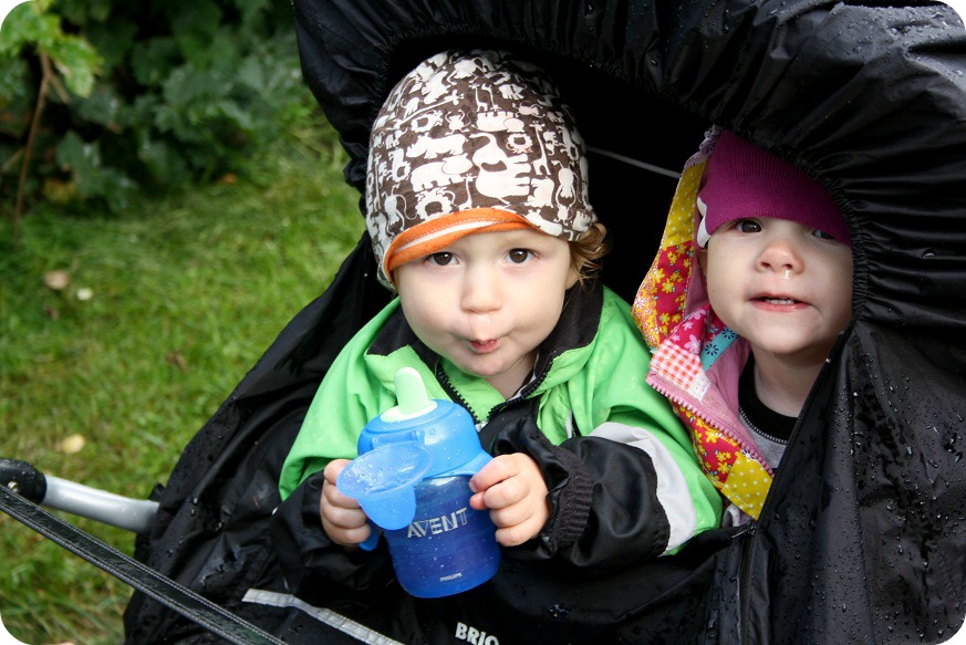 Vi överraskades av en av skurarna, när vi var ute och lekte. Först tänkte vi stanna och vänta ut de andra mammorna som gick undan regnet. Lite regn, liksom. Men herkas, det vräkte ner och ungarna började gråta, så vi fick dra hemåt bums!