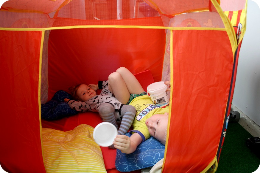 Det är ju tur att man kan stänga ute regn och rusk på balkongen och mysa i ett tält! Nåja, det blev lite trångt när Isaac kom och skulle leka tittut på baksidan, rev ner den och skrattade som en tok, medan William räknade tre gånger tre och två gånger fyra.