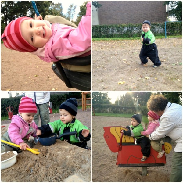 Det är visserligen inte långt till bilen, 250 meter, men ungarna vill absolut gå själva. Twinsen brölar och skriker ”GAA-GAA!” om de inte får gå. William är så duktig, han brukar hålla i sin lillebror jag och håller Milja (som har en tendens att sätta sig ner med jämna mellanrum) och kassarna. Sen ska man ut ur bilen med två små, på vägen, och jag är ofta rädd att de ska sticka iväg, men hittills har de inte gjort det. Kanske är det nåt slags gruppbeteende som slår in? Eller kommer det där trotset senare? I så fall hoppas jag det kommer nästa år när W är på förskolan.