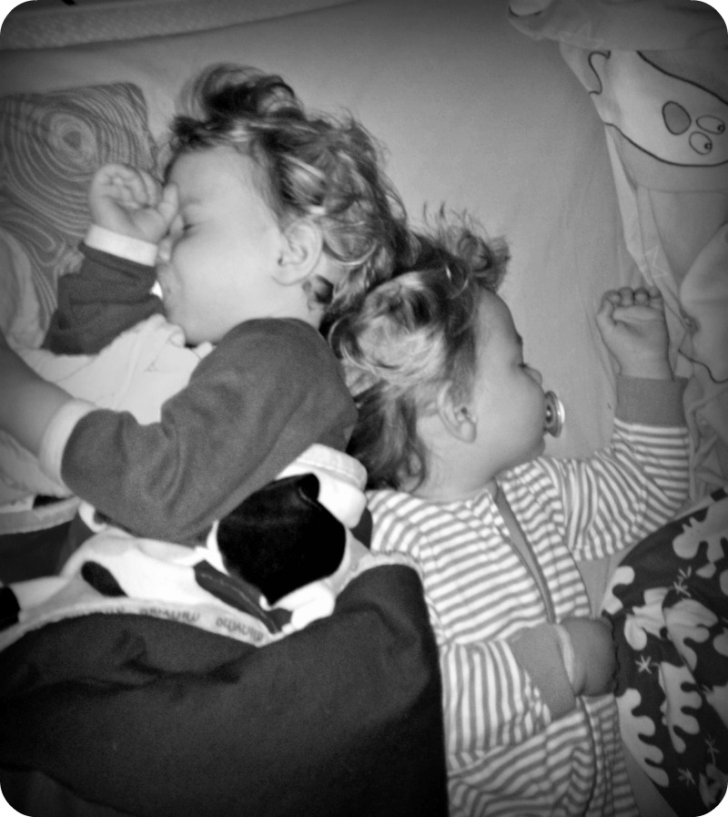Hur man det komma sig att man glömmer hur jobbiga och tunga ungarna är att bära, trösta och släpa runt, när det sover som små söta lamm? När de ligger där med sina varma händer och fötter (jo, jag vet, jag skriver jämt om dem, men de är ju så bedårande nätta), slingrar sig runt mina armar och pillar mig i håret? Att man glömmer de där gånger man kravlar under bordet och försöker plocka upp grynost och gurka, sen byta en bajsblöja, sen äta själv och man funderar påoch hur maten bara går runt, runt? Eller att man hittar torkat ris i den egna sängen, nedtrampade makaroner under sockorna och en liten bit bulle mellan soffans kuddar?