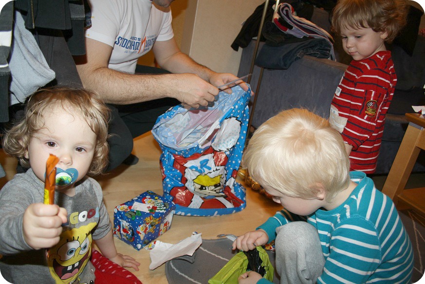 Det blev ett par hastiga maträtter och panikinslagning av små julklappar, som jag inte hunnit eller orkar med igår. Sen kom ”klappabocken” med småbilar, en liten bok och godis och lite sånt åt alla tre barnen. Småbilar går alltid hem, hos alla! Visserligen skulle twinsen säkert klara sig utan klappar, de är glada över chokladrussin och lite godis, men nån liten grej vill jag ge. Jag gillar lillajul, det ska vara lite magiskt. Den här helgen saknade jag i Sverige, där det ”bara” är första advent.