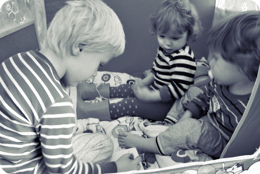 Ett tag idag var det helt tyst utan att någon gjorde nåt galet (som att vrida på spisplattan, rycka som en tog i ugnsluckan eller klättra upp på databordet). Där satt de alla tre, ihopkrupna och fokuserade i kojan. William lekte skola och Milja hade dragit på sig stövlarna, Isaac satt och lyssnade.