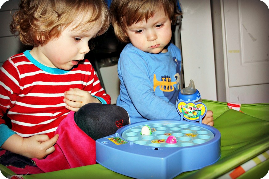 En liten, gammal och mycket högljudd fiskdamm. Den surrar som ett tröskverk och spelar högt, trots att jag satt tejp över högtalaren. Två små fiskar är ungefär allt som finns kvar, men Isaac och Milja ville ha på den igen och igen och skrattade förtjust när fiskarna öppnade munnen.